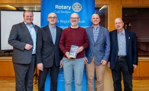 Lesung mit Dr. Peter Tauber. v.l.n.r.. Max Breitenbach, Bürgermeister Rodgau - Dr. Carsten Lehr, Kuratoriumsvorsitzender Hospiz Stiftung Rotary Rodgau (HSSR) - Dr. Peter Tauber - Stephan Megnin, Präsident Rotary Club Rodgau - Herbert Sahm, Schatzmeister HSRR